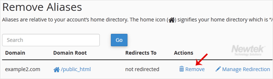 Under Remove Aliases, locate the parked domain name and click on Remove.