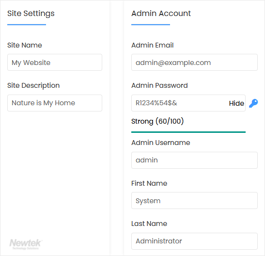 • Admin Username: Your new Pubvana username (for security reasons, do not use the administrator or the admin username).