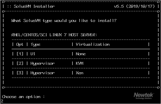 Step 2: For CentOS 7, It will show you the option to choose virtualization. Most people prefer KVM or Xen. Select your preferred virtualization by typing 2 or 3 and then press Enter. For KVM, we type 2 and then press Enter.