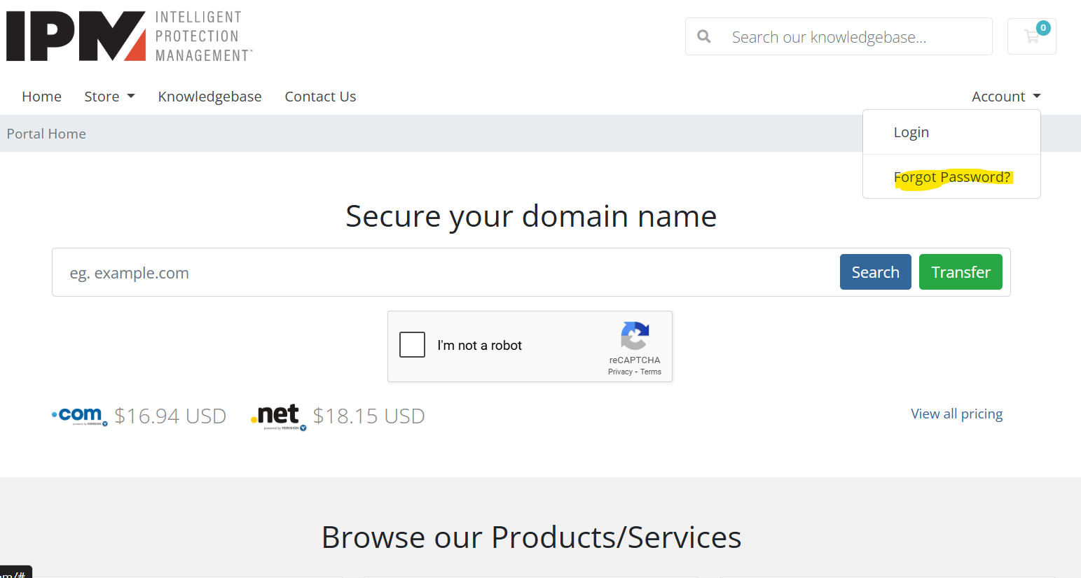 1. Navigate to https://manage.ipm.com. You will see the Account button in the top right corner. Click that, then Forgot Password.