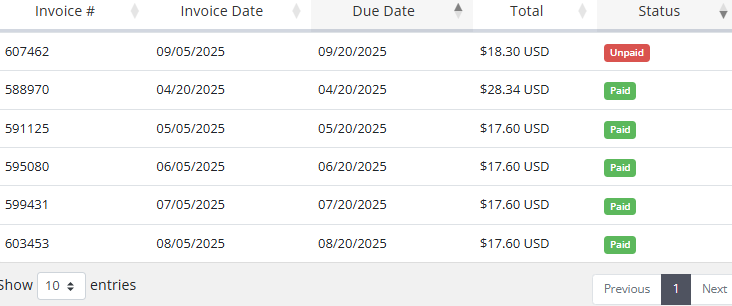Please note that if payment is not received 15 days after the due date, your services will be suspended, and 10% late fee will be applied to the invoice.